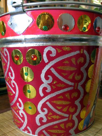 La parte superior la forré de papeles dorados y luego lo barnicé (todo el mueble va barnizado). Para rizar el rizo, le añadí un remate de resina pintado en oro y fucsia y le añadí un poco de brilli, brilli dorado.